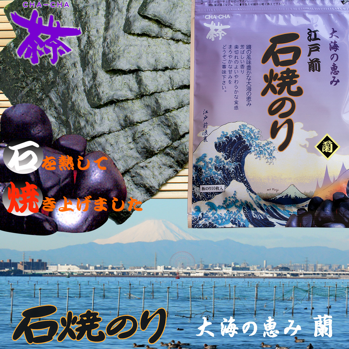 磯の風味豊かな色艶良く柔らかで、旨みのある特上の江戸前ちば海苔を、熱した石でじっくりと自然の風味豊かに焼き上げた焼き海苔です。