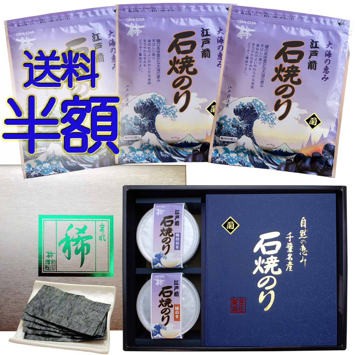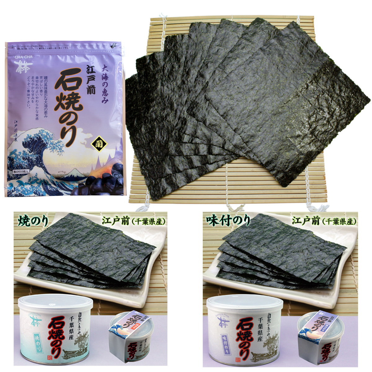磯の風味豊かな色艶良く柔らかで、旨みのある特上の江戸前ちば海苔を、熱した石でじっくりと自然の風味豊かに焼き上げた焼き海苔です。そして8切にした味付海苔としそ風味の詰合せです。開封後も残った海苔を保存しやすいように、アルミチャック袋入りと丸缶入り。
